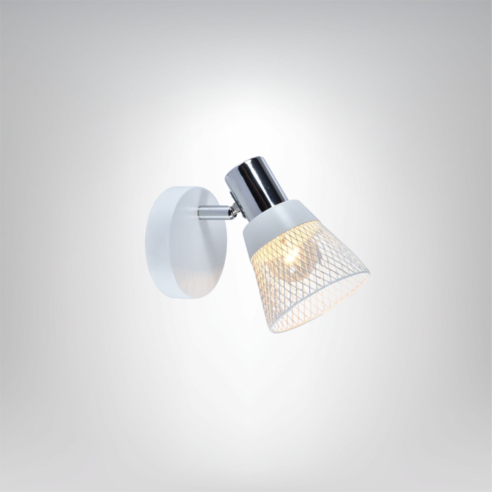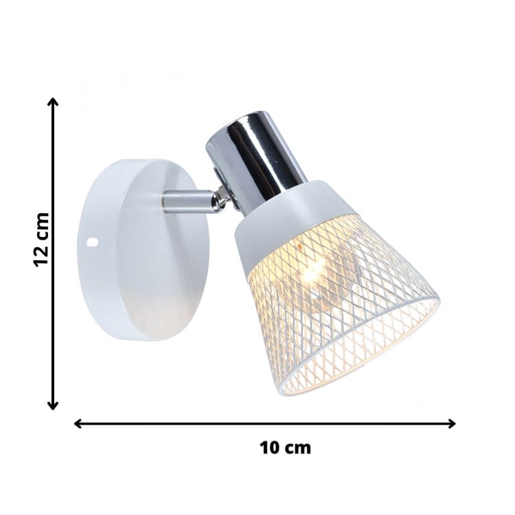Kinkiet Flavio to stylowa oprawa ścienna, która łączy prostotę formy z nutą industrialnego charakteru. Metalowy, ażurowy klosz w kolorze bieli z chromowanymi detalami pięknie rozprasza światło, tworząc subtelny efekt i przyjemną atmosferę we wnętrzu.