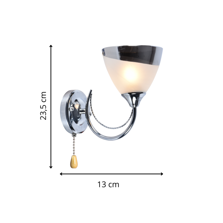 Kinkiet Negi to klasyczna propozycja dla miłośników eleganckiego i ponadczasowego oświetlenia. Połączenie błyszczącego chromu z mleczno-srebrnym kloszem tworzy subtelny, ale wyrafinowany efekt wizualny. Delikatny łańcuszek z drewnianym zakończeniem dodaje lampie uroku oraz ułatwia jej obsługę. Idealnie sprawdzi się jako oświetlenie boczne w salonie, sypialni czy przedpokoju, wprowadzając przyjemne, ciepłe światło.