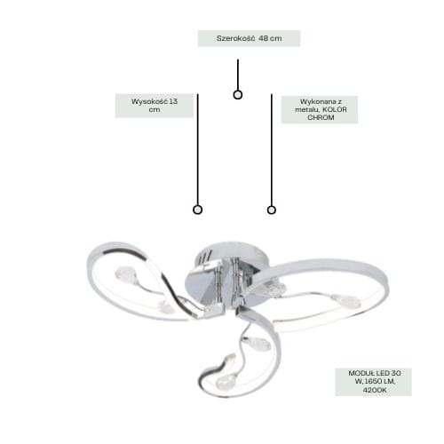 Lampa sufitowa Natalie 3 zachwyca nowoczesnym, falistym kształtem oraz subtelnymi kryształowymi zdobieniami, które pięknie odbijają światło. Chromowane wykończenie i wbudowane LED-y tworzą elegancką, efektowną całość idealną do salonu lub sypialni. To stylowa propozycja dla wnętrz, które potrzebują wyrazistego, designerskiego oświetlenia.