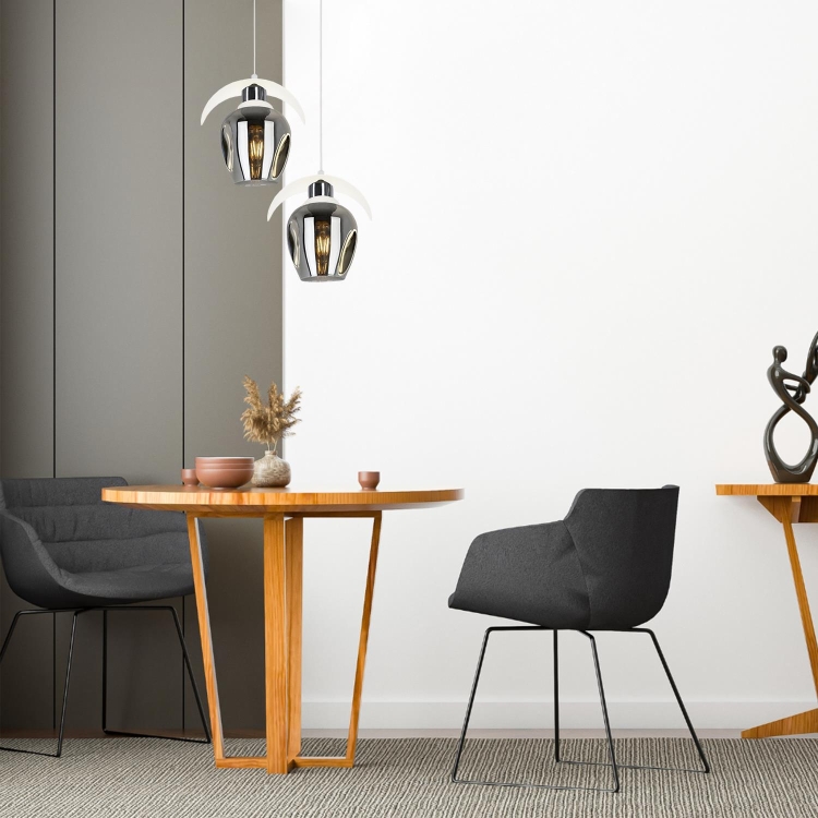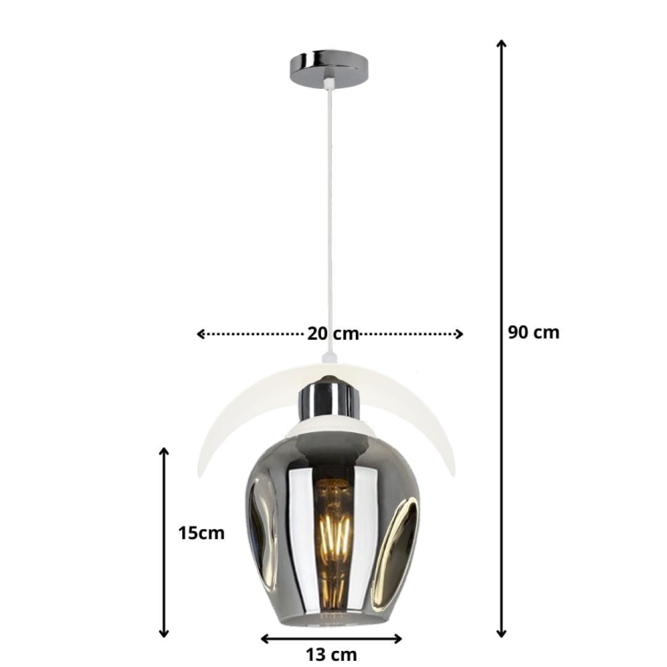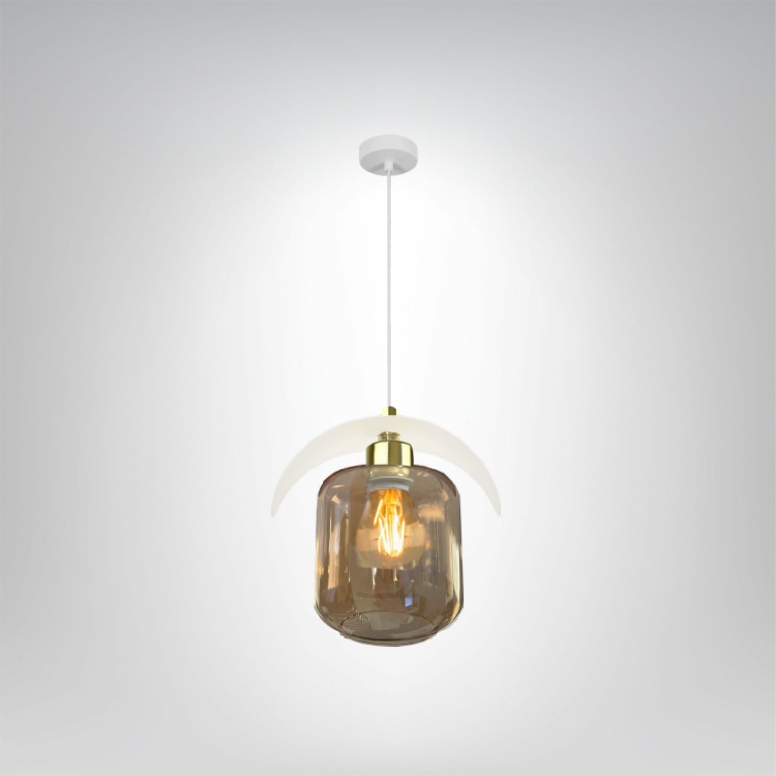 Lampa Delio 1C to wyjątkowe połączenie dekoracyjnego, przydymionego szkła z eleganckimi, złotymi akcentami oraz charakterystyczną, białą metalową obręczą. Jej unikatowy design przyciąga wzrok i dodaje wnętrzu nowoczesnej lekkości, a jednocześnie wprowadza przytulny klimat dzięki pięknemu rozproszeniu światła. Model doskonale prezentuje się nad wyspą kuchenną, stołem w jadalni czy w salonie, tworząc efektowny punkt dekoracyjny.