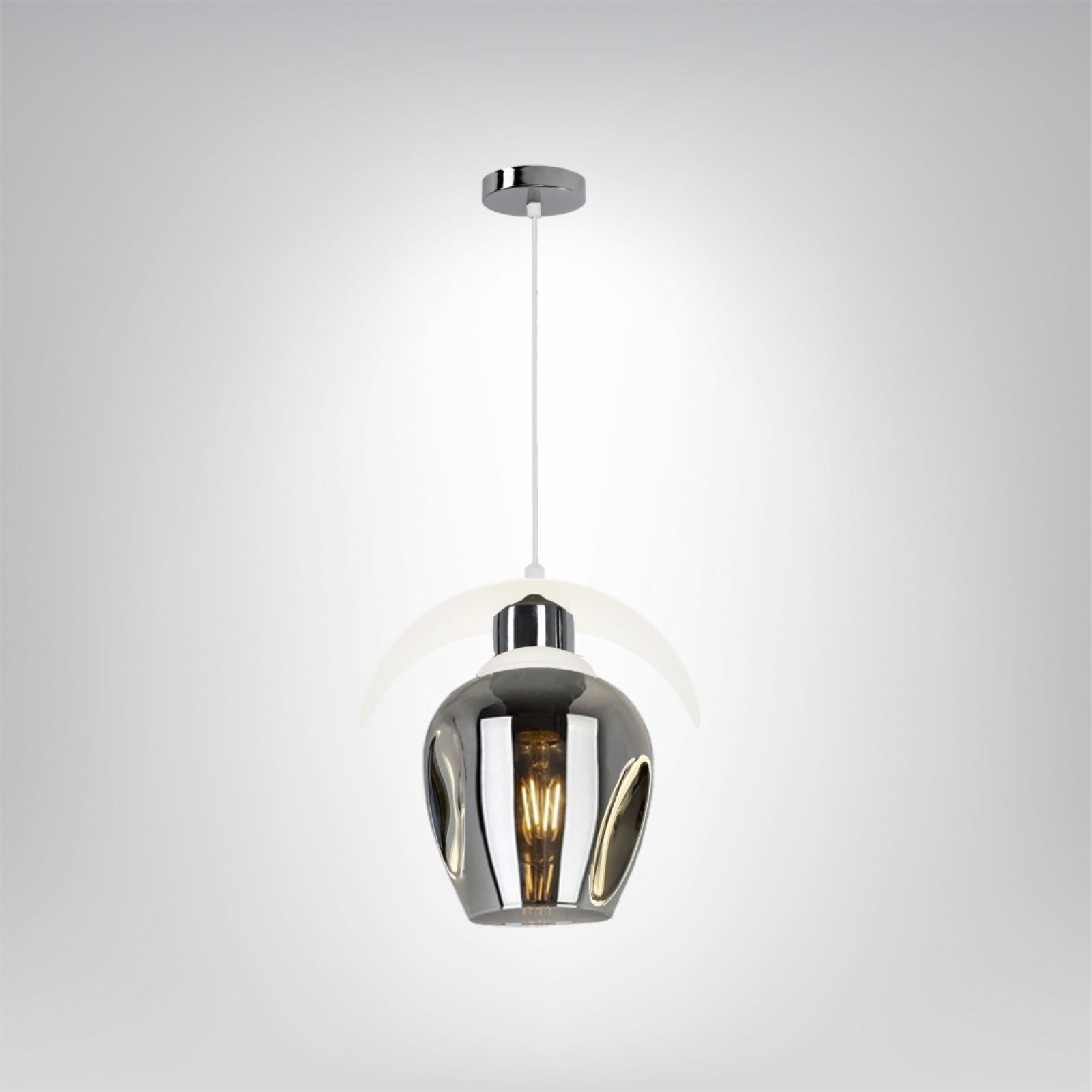 Delio 1D to efektowna lampa wisząca, która łączy lustrzany szklany klosz z dekoracyjną, białą obręczą nadającą całości lekko futurystycznego charakteru. Lustrzana powierzchnia szkła pięknie odbija otoczenie, a po włączeniu światła tworzy nastrojowy efekt z widoczną żarówką typu filament. Metalowe elementy w chromowanym wykończeniu podkreślają elegancję i nowoczesność modelu.