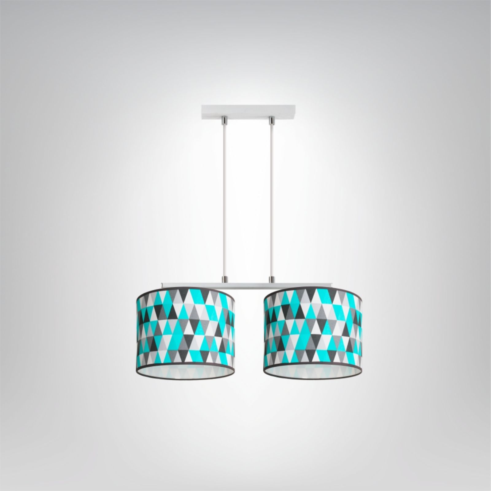 Demeter 2 to designerska lampa sufitowa z dwoma abażurami ozdobionymi modnym, geometrycznym wzorem w odcieniach turkusu, szarości i bieli. Połączenie lekkiego, białego stelaża z żywą kolorystyką tkaniny sprawia, że model doskonale odnajduje się w nowoczesnych aranżacjach – szczególnie w jadalniach, salonach i pokojach młodzieżowych. Dwupunktowe źródło światła równomiernie oświetla przestrzeń, tworząc przy tym efektowny, dekoracyjny element wystroju.