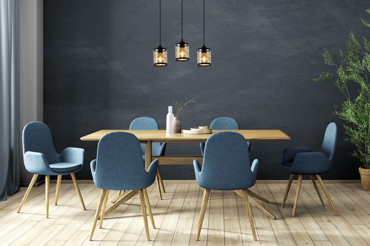 Lampa wisząca Erico 3L to stylowe oświetlenie, które łączy nowoczesną formę z subtelnym, industrialnym charakterem. Trzy transparentne klosze z delikatnym dymionym wykończeniem oraz dekoracyjnymi przetłoczeniami tworzą efekt przestrzenności i pięknie rozpraszają światło, eksponując żarówki w stylu vintage. Całość zawieszona jest na eleganckiej, czarnej listwie, dzięki czemu lampa doskonale sprawdzi się nad stołem w jadalni, blatem kuchennym lub w salonie, dodając wnętrzu wyjątkowego klimatu.