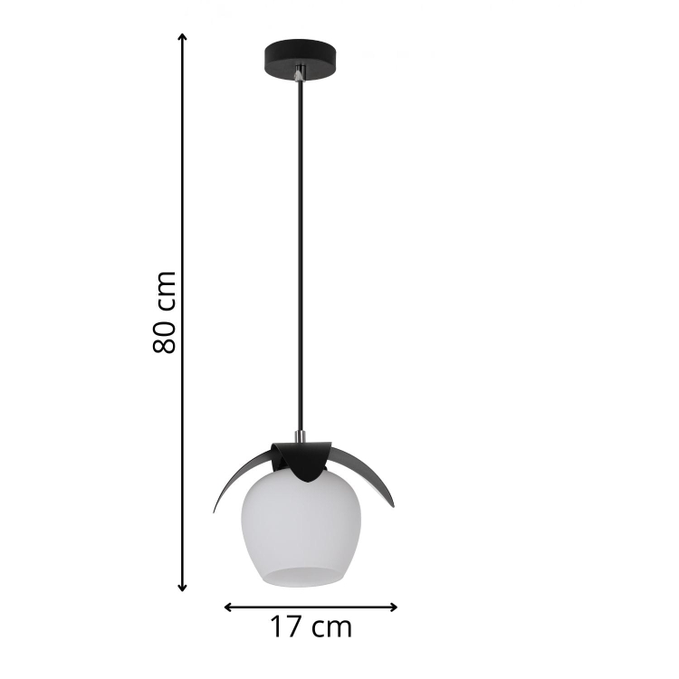Lampa wisząca Malaga 1 to eleganckie połączenie nowoczesnej formy z delikatną, subtelną stylistyką. Jej charakterystyczny klosz o łagodnym, zaokrąglonym kształcie wykonany jest z matowego szkła, które zapewnia przyjemnie rozproszone, miękkie światło. Metalowe ramiona w odcieniu czerni tworzą dekoracyjny motyw przypominający otwartą formę kwiatową, nadając lampie lekkości i wyjątkowego charakteru.