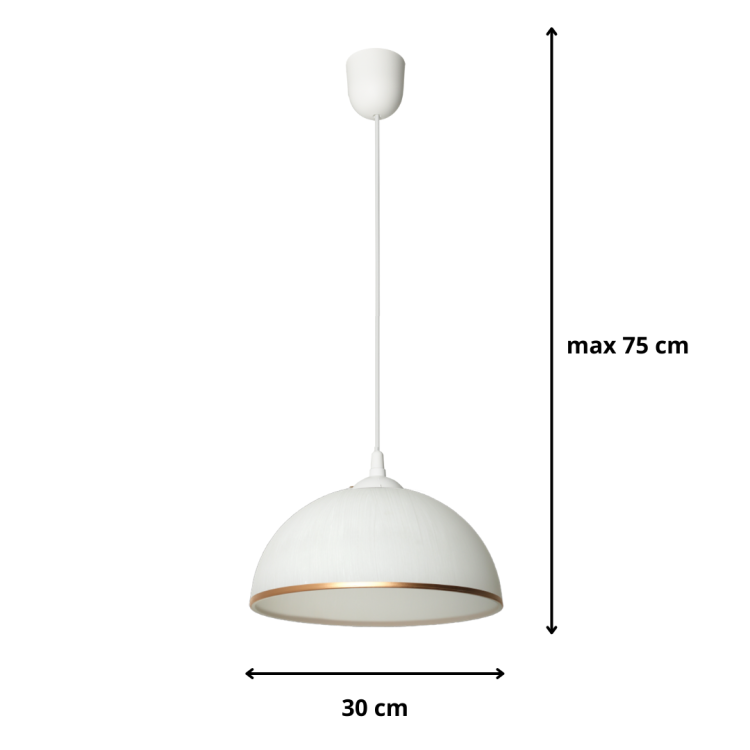 Lampa wisząca Margaret E to klasyczna propozycja w nowoczesnej odsłonie, idealna do kuchni, jadalni czy salonu. Jej klosz wykonano z trwałego tworzywa w białym, subtelnym wykończeniu z elegancką, złotą linią na dole – dodaje to całości lekkości i ponadczasowego charakteru. Prosta forma plafonu w połączeniu z jednolitą kolorystyką sprawia, że lampa świetnie współgra zarówno z aranżacjami skandynawskimi, minimalistycznymi, jak i bardziej klasycznymi.