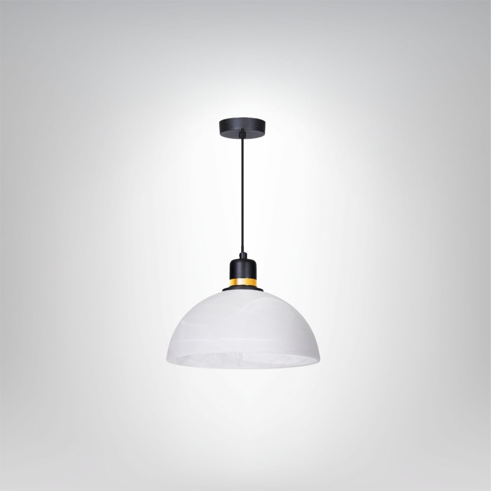 Lampa wisząca Mercure B to eleganckie połączenie klasycznej formy z nowoczesnymi detalami, idealne do wnętrz wymagających subtelnej, lecz efektownej dekoracji świetlnej. Klosz wykonany z białego szkła o delikatnej, marmurkowej strukturze tworzy łagodne, równomierne światło, które sprzyja relaksowi i buduje przyjemną atmosferę. Nad kloszem znajduje się czarny element z dekoracyjną złotą opaską, która nadaje całości wyrafinowanego charakteru i dodaje lampie eleganckiego, luksusowego akcentu.