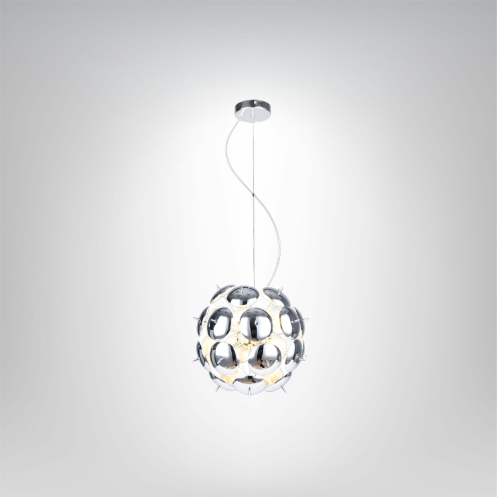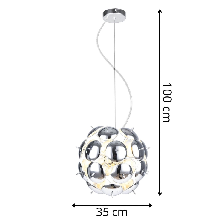 Chromowane elementy odbijają światło, tworząc efekt głębi i eleganckiego połysku. Wewnątrz konstrukcji osadzono aż osiem punktów świetlnych, które rozświetlają pomieszczenie wielowymiarowym, dynamicznym blaskiem.
