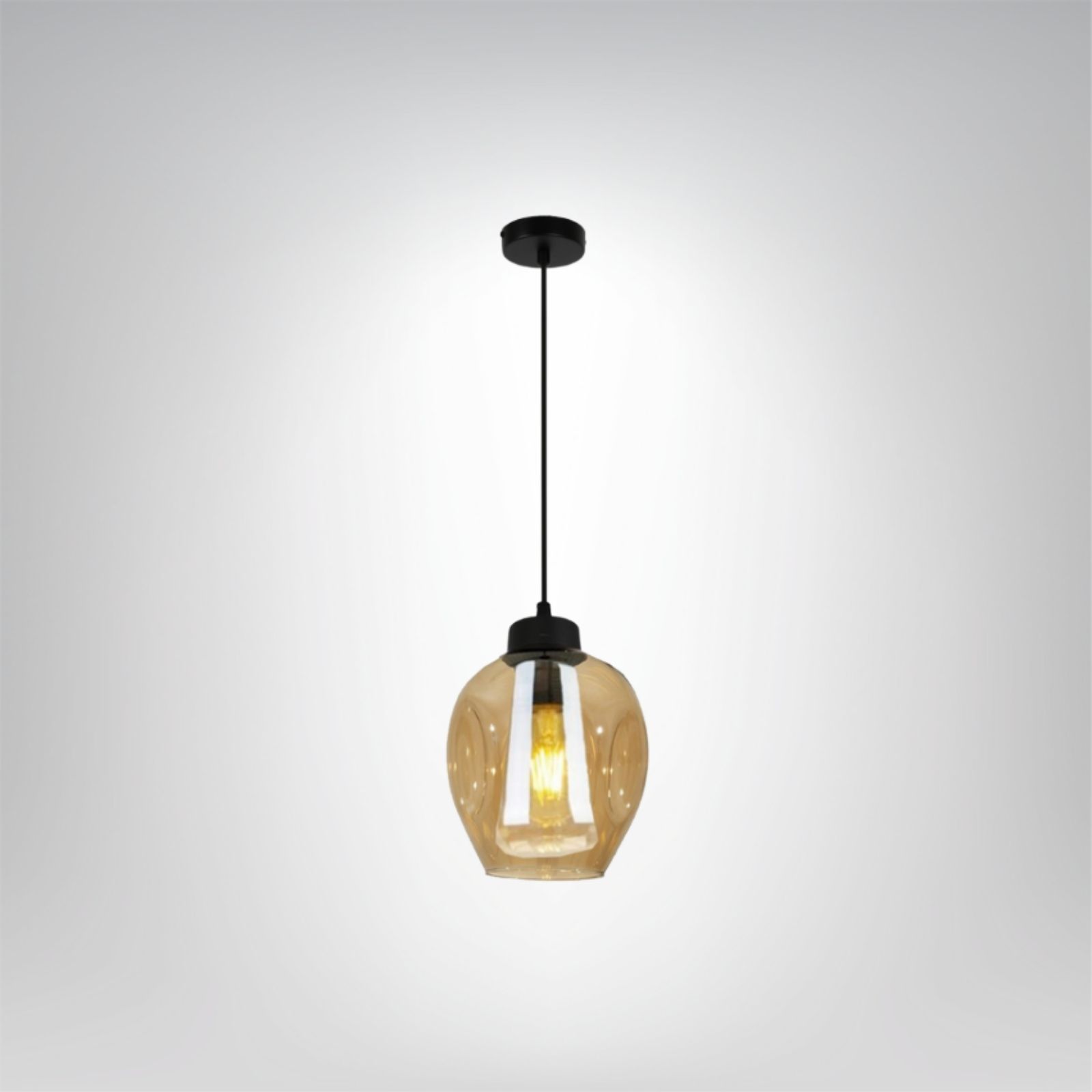 Lampa wisząca Santo 1C to eleganckie połączenie nowoczesności i ciepłej, przytulnej estetyki. Jej charakterystyczny klosz wykonany został z bursztynowego szkła o delikatnie zaokrąglonej formie, z subtelnymi przetłoczeniami, które nadają mu wyjątkową głębię. Szkło pięknie rozprasza światło, tworząc nastrojową aurę i efektowne refleksy, a jednocześnie perfekcyjnie eksponuje dekoracyjną żarówkę – szczególnie filamentową. Czarna oprawa i przewód dodają lampie nowoczesnego kontrastu, podkreślając jej elegancki charakter.