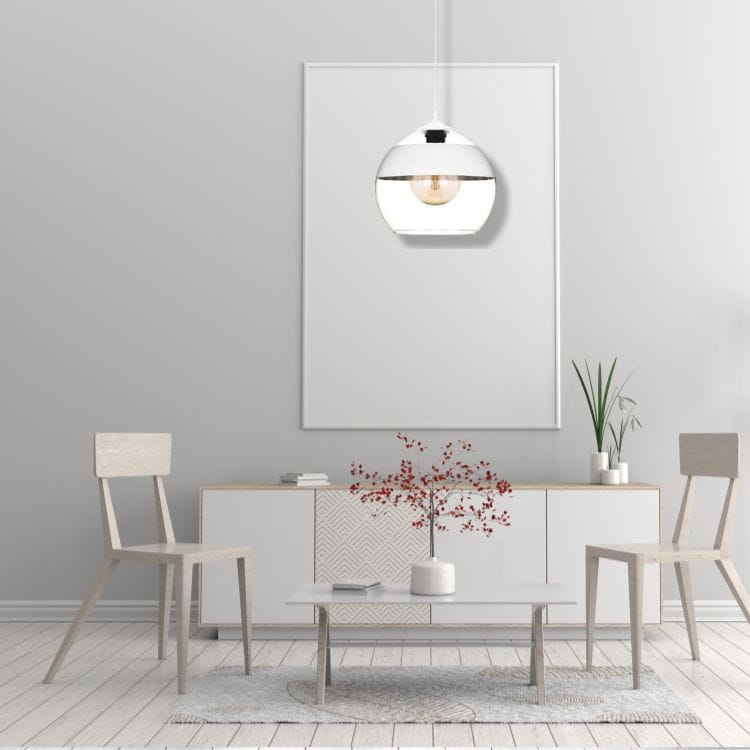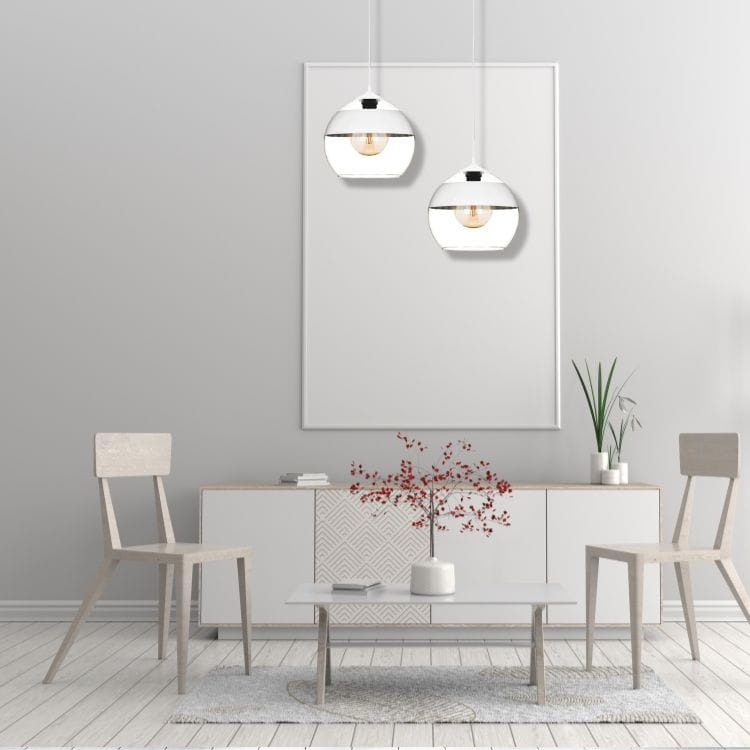 Thalin dostępny jest w dwóch rozmiarach — 1L (większy) i M (mniejszy) — co pozwala dopasować go zarówno do dużych, jak i mniejszych pomieszczeń. Biała oprawa i przewód tworzą spójną całość z kloszem, dzięki czemu lampa świetnie odnajduje się w jasnych, nowoczesnych wnętrzach. Idealnie komponuje się ze stylami: skandynawskim, minimalistycznym, soft modern czy klasycznym.