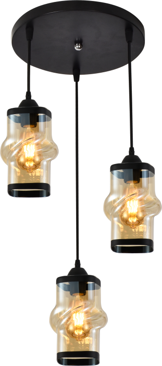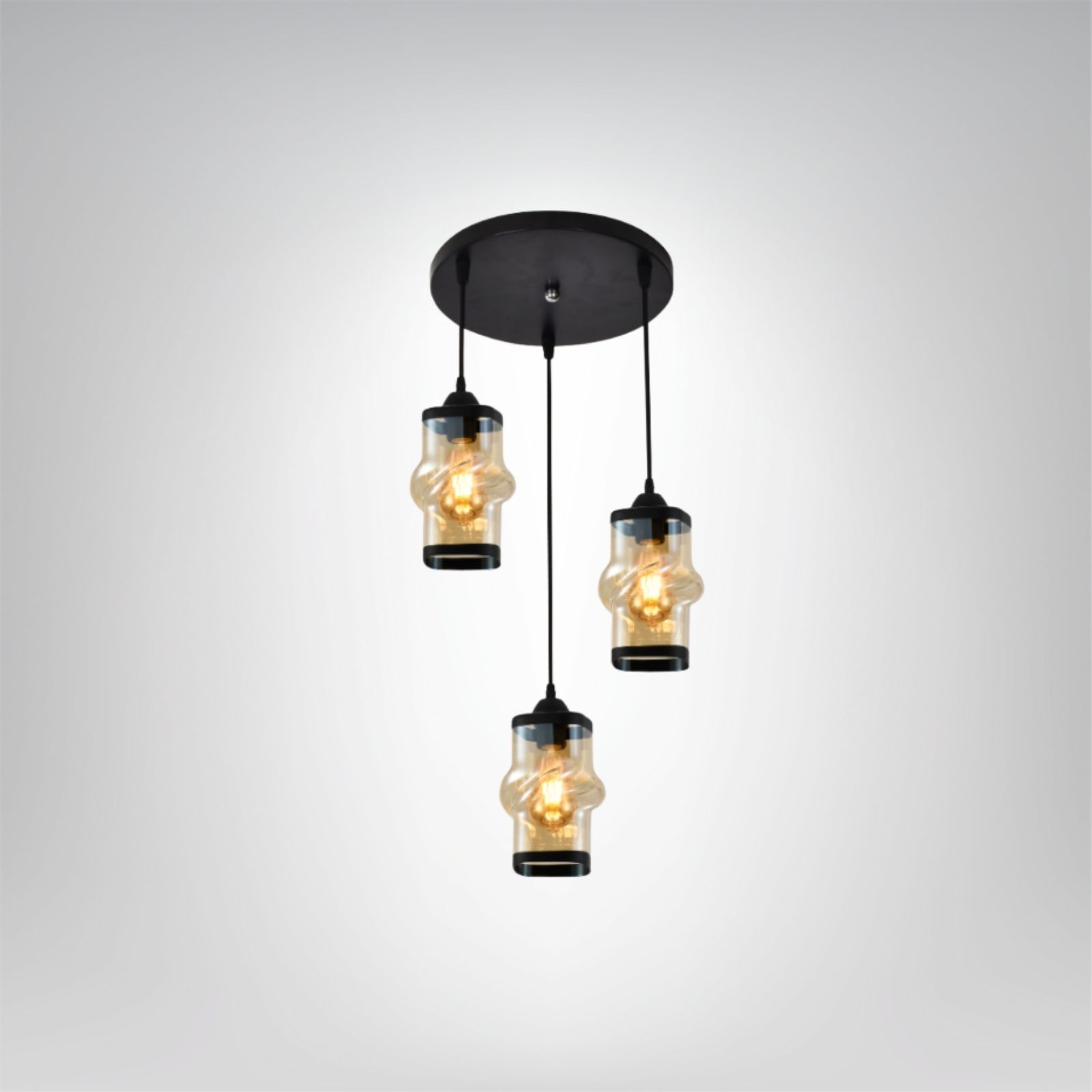 Lampa wisząca Zain 3P to nowoczesna kompozycja trzech szklanych kloszy w efektownym, falowanym kształcie, zawieszonych na okrągłej podsufitce. Transparentno-bursztynowe szkło pięknie rozprasza światło, tworząc ciepłą i przytulną atmosferę, a jego nieregularna forma dodaje całości artystycznego wyrazu. Każdy klosz zawieszony jest na innej wysokości, dzięki czemu lampa tworzy dynamiczną, niezwykle dekoracyjną kompozycję.