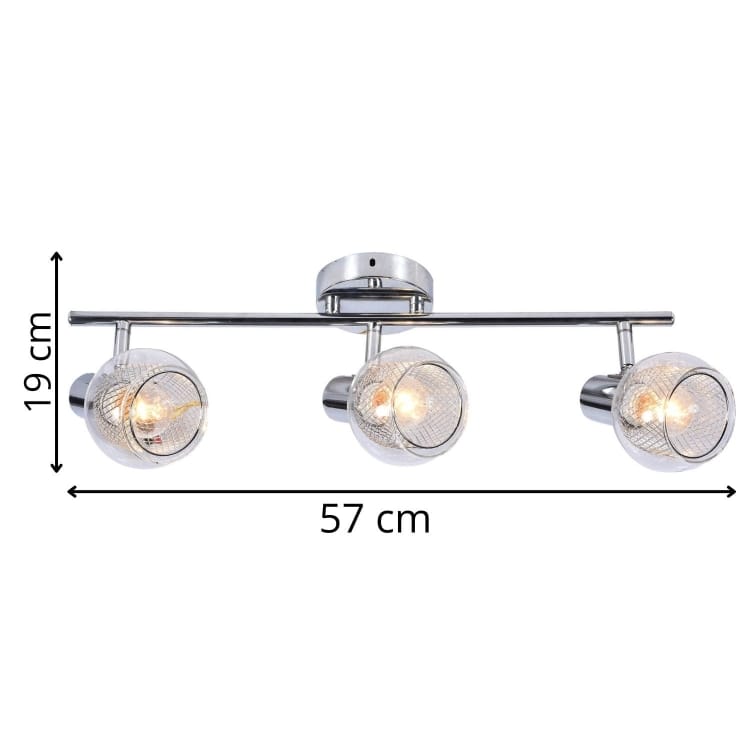 Listwa Gavi 3 to połączenie stylu i praktyczności, idealne dla osób ceniących eleganckie detale w oświetleniu. Trzy kuliste, szklane klosze z wewnętrzną, metalową siatką tworzą subtelny efekt świetlny, rozpraszając światło w sposób wyjątkowo dekoracyjny. Chromowana konstrukcja dodaje całości lekkości i nowoczesnego blasku.