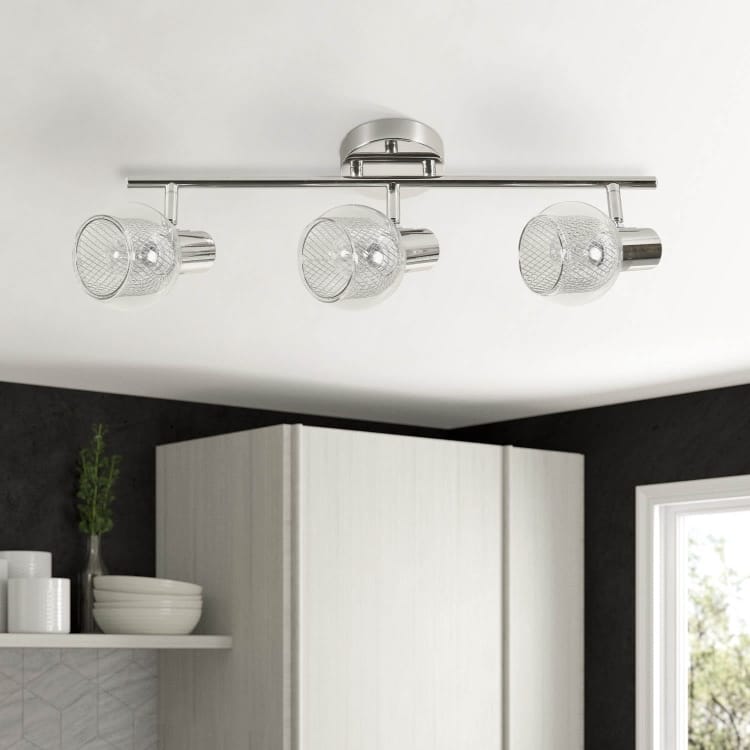 Listwa Gavi 3 to nowoczesna lampa sufitowa z trzema szklanymi kloszami i chromowanym wykończeniem. Ażurowe wnętrze kloszy tworzy subtelny efekt świetlny, łącząc funkcjonalność z elegancją.