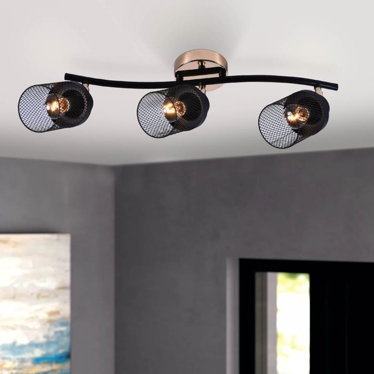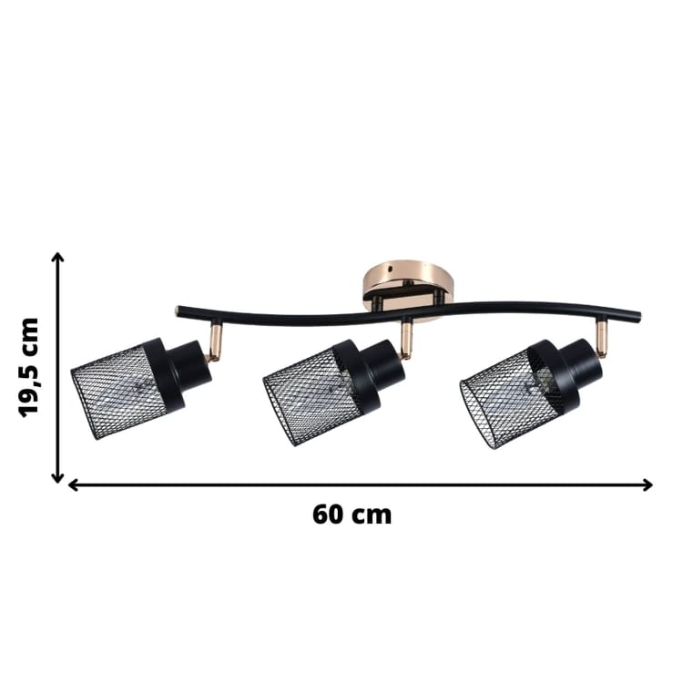 Listwa sufitowa Gissi 3 to stylowe oświetlenie o nowoczesnym, lekko industrialnym charakterze. Trzy metalowe, czarne klosze w formie siatkowych cylindrów połączono z eleganckimi, złotymi detalami, tworząc harmonijny kontrast barw i materiałów. Dzięki regulowanym głowicom można łatwo skierować światło w wybrane miejsca, co sprawia, że listwa doskonale sprawdzi się w salonie, kuchni czy przedpokoju.