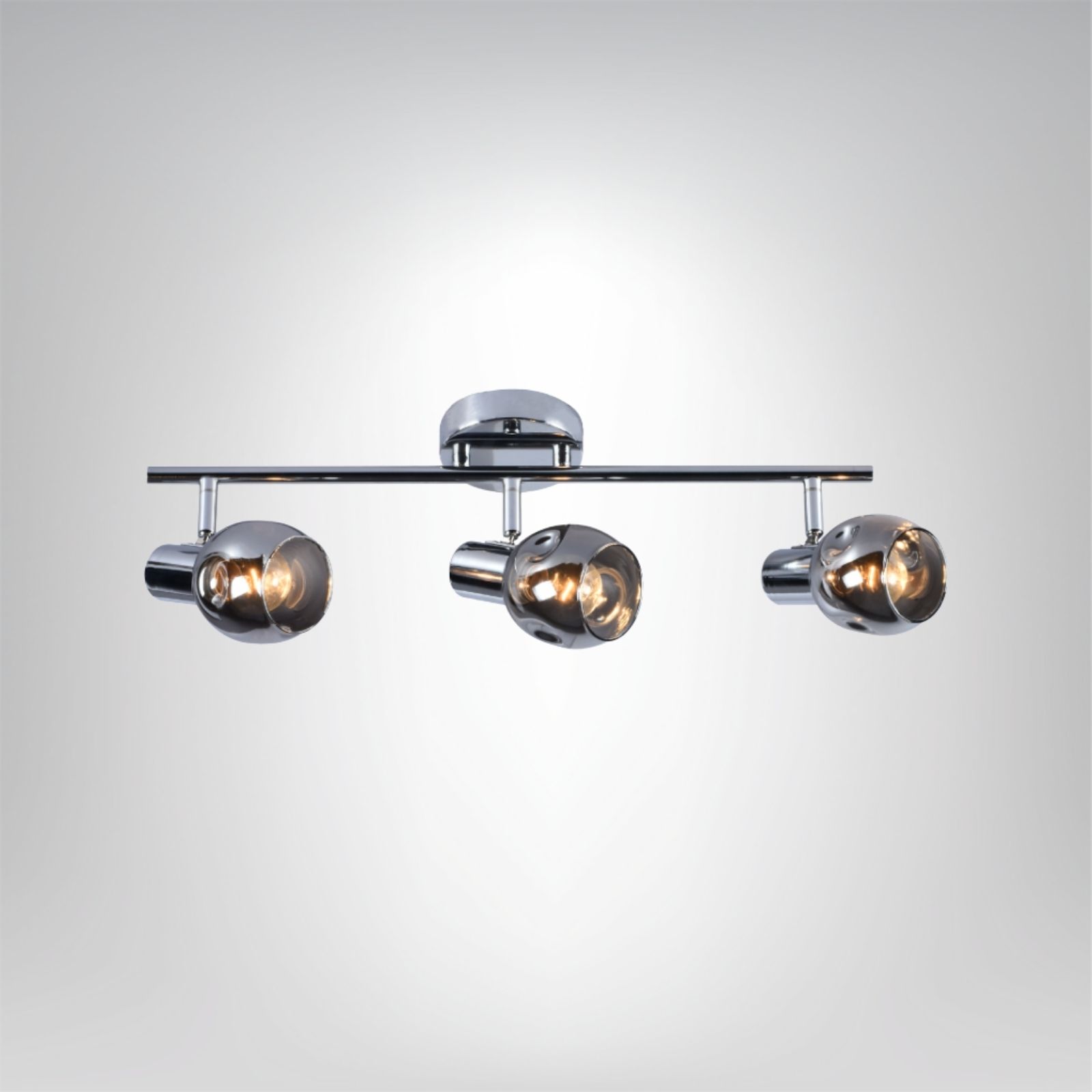 Nowoczesna listwa Lugio 3 z trzema chromowanymi reflektorami i szklanymi kloszami w odcieniu dymionym to elegancki sposób na doświetlenie wnętrza z klasą i blaskiem.