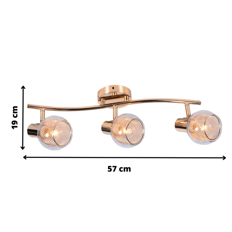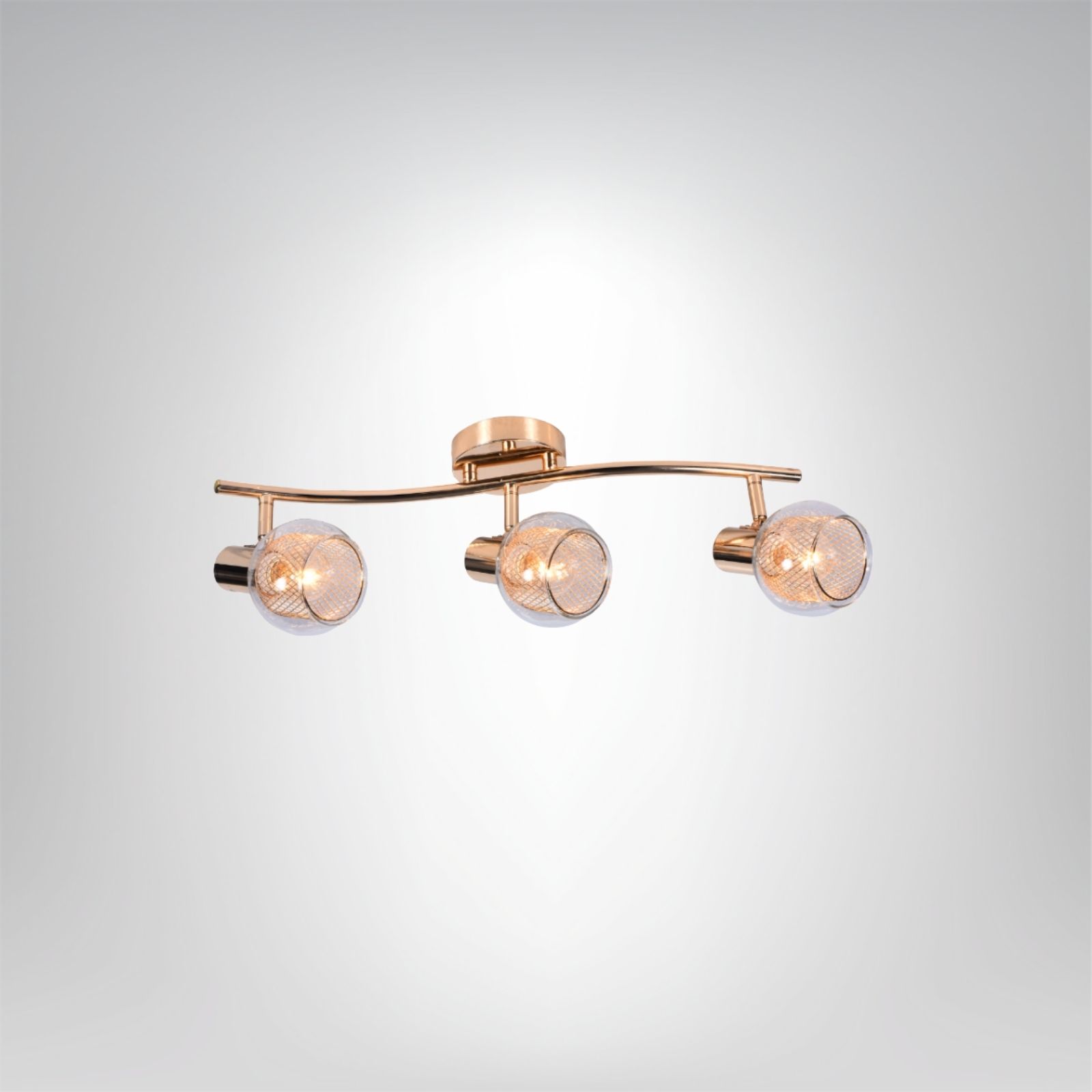 Listwa sufitowa SOMI 3 to eleganckie i stylowe oświetlenie, które wprowadza do wnętrza ciepło, blask i ekskluzywny charakter. Jej wyjątkowe klosze składają się z dwóch warstw: zewnętrznej, szklanej kuli oraz wewnętrznej, złotej metalowej siateczki. Takie połączenie tworzy zachwycający efekt świetlny — światło subtelnie przenika przez strukturę siateczki, nadając pomieszczeniu przytulność i wyrafinowany styl. Złote, połyskujące wykończenie podkreśla luksusowy design lampy i sprawia, że staje się ona efektownym elementem dekoracyjnym.
