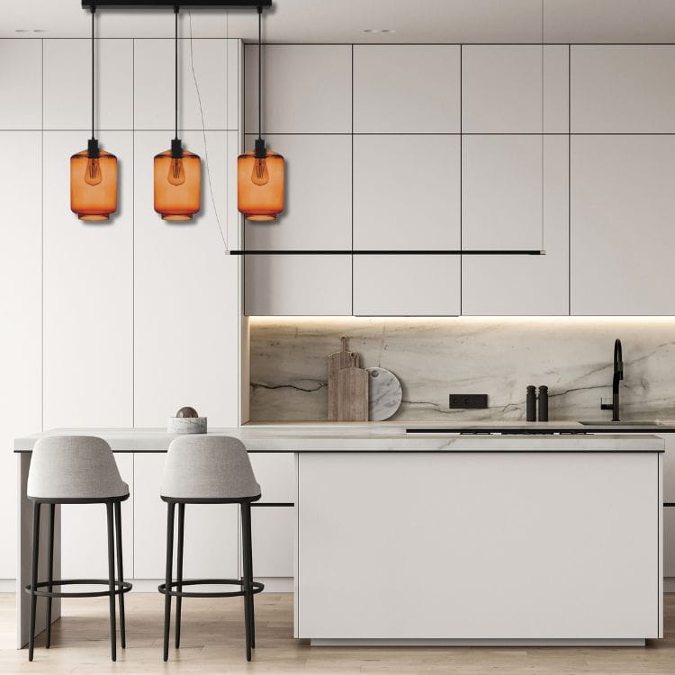 Ciepła barwa kloszy pięknie filtruje światło, tworząc przytulną atmosferę i efektownie eksponując dekoracyjne żarówki typu filament. Model Inverno 3B świetnie komponuje się zarówno z wnętrzami w stylu industrialnym, skandynawskim, jak i nowoczesnym.