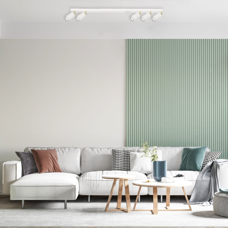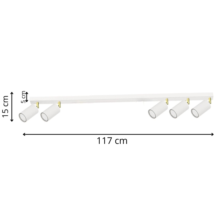 Plafon Larisa 5 to rozbudowana i niezwykle funkcjonalna oprawa oświetleniowa, stworzona z myślą o większych i otwartych przestrzeniach. Długa, smukła listwa w kolorze białym została wyposażona w pięć regulowanych reflektorów, które pozwalają na precyzyjne doświetlenie wielu stref jednocześnie. Subtelne, złote detale przy mocowaniach spotów dodają całości elegancji i nowoczesnego charakteru.