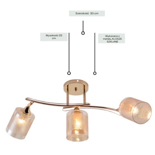 Żyrandol Benta 3 to stylowe oświetlenie sufitowe, które łączy elegancję z nowoczesną lekkością formy. Trzy szklane klosze o cylindrycznym kształcie, osadzone na delikatnie wygiętym, metalowym ramieniu, tworzą harmonijną i efektowną kompozycję. Złote wykończenie konstrukcji podkreśla luksusowy charakter lampy, dodając wnętrzu ciepła i klasy.