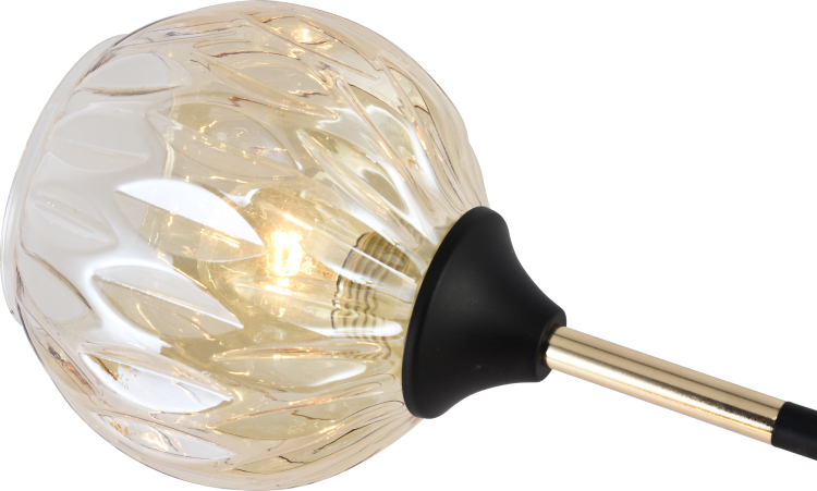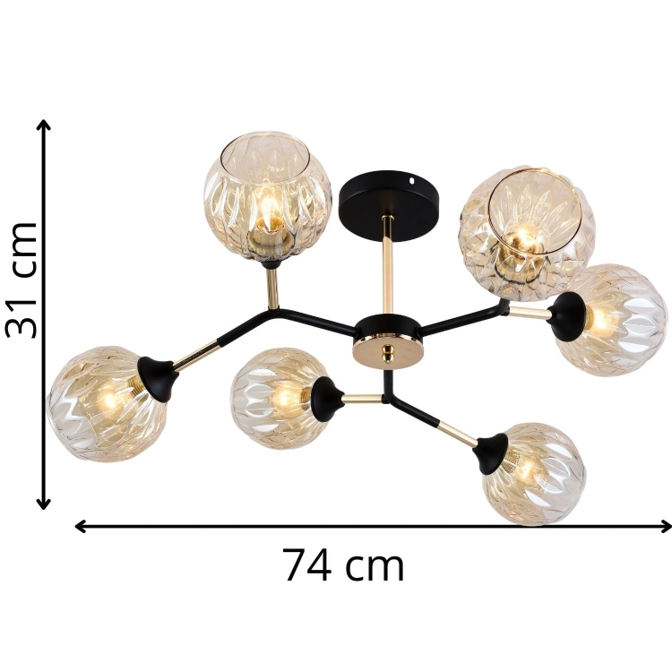 Żyrandol Briana 6 to efektowne oświetlenie sufitowe, które łączy nowoczesną formę z nutą eleganckiego stylu glamour. Konstrukcja oparta na czarnej metalowej podstawie została wzbogacona złotymi akcentami, które nadają całości wyrafinowanego charakteru. Sześć ramion zakończonych dekoracyjnymi, szklanymi kloszami o strukturalnej powierzchni tworzy harmonijną i przyciągającą wzrok kompozycję.