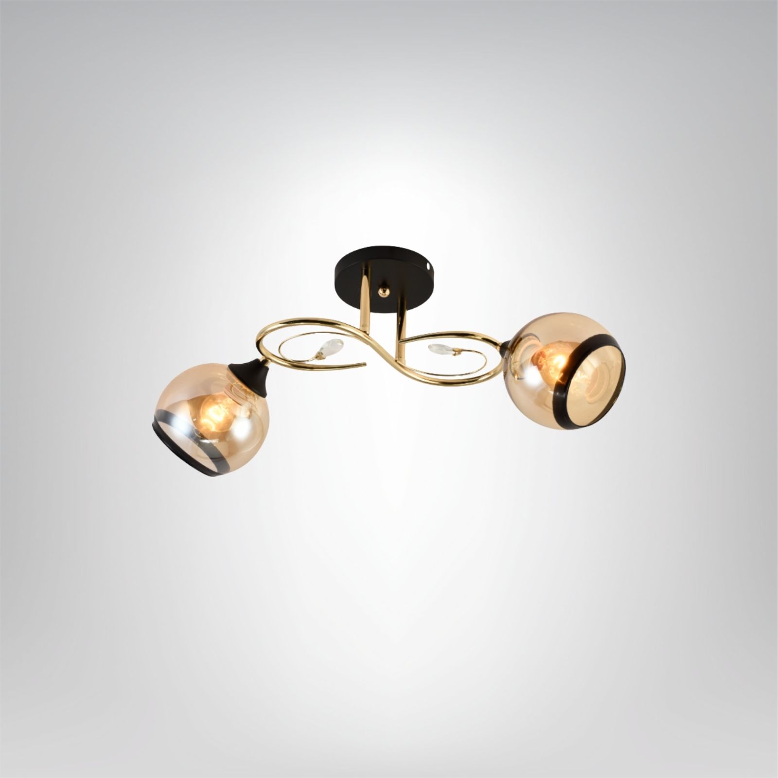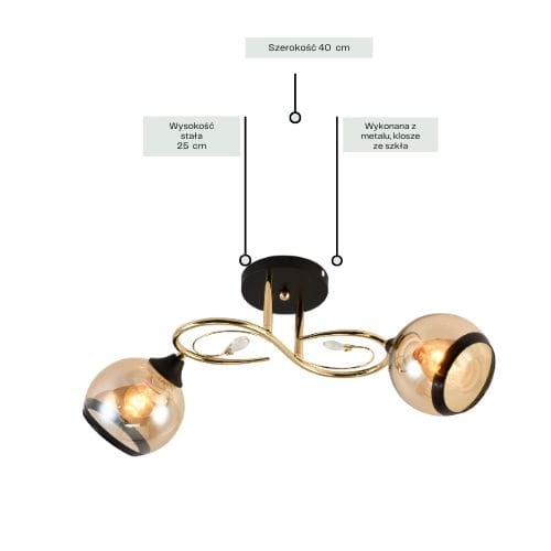Żyrandol Gabriella 2 to elegancka lampa sufitowa, która łączy dekoracyjną, falującą linię ramion z nowoczesną lekkością formy. Złote, metalowe elementy tworzą subtelny kontrast z czarną podsufitką oraz efektownymi, szklanymi kloszami w ciepłym odcieniu. Dwa punkty światła zapewniają przyjemne, nastrojowe oświetlenie, idealne do mniejszych i średnich pomieszczeń.