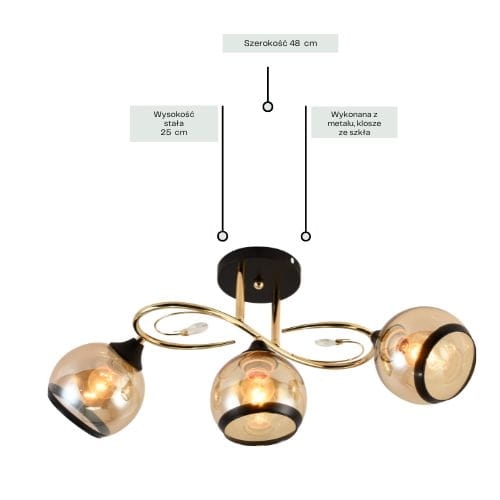Żyrandol Gabriella 3 to efektowna lampa sufitowa, która łączy elegancką formę z dekoracyjnym charakterem. Trzy punkty światła rozmieszczone na delikatnie falujących, złotych ramionach tworzą harmonijną i lekką kompozycję. Szklane klosze w ciepłym, bursztynowym odcieniu subtelnie rozpraszają światło, budując przytulną atmosferę we wnętrzu.
