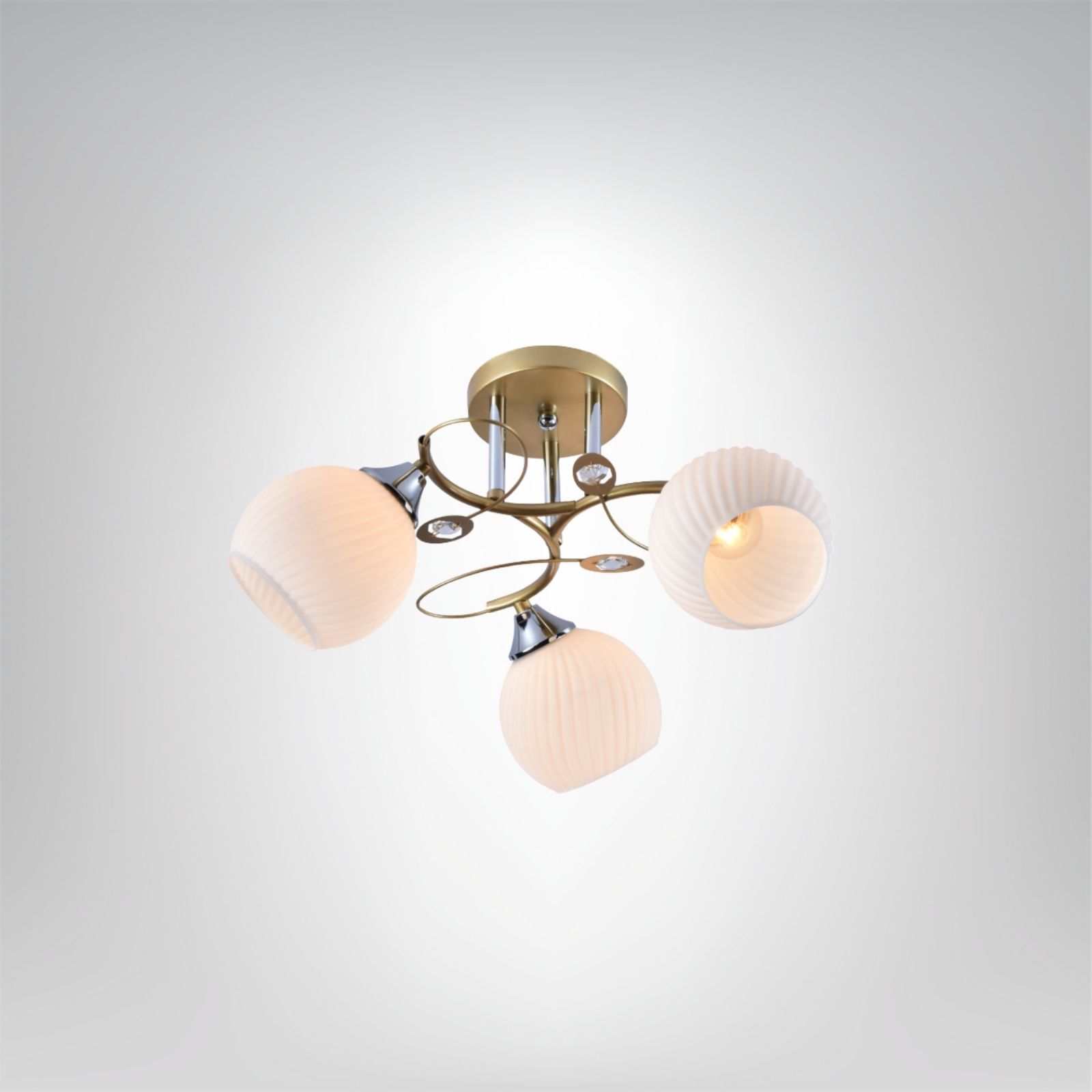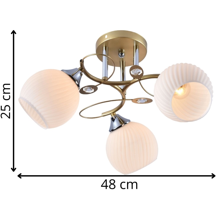 Stylowy żyrandol w złotym wykończeniu z trzema mlecznymi kloszami, który zapewnia przyjemne, nastrojowe oświetlenie. Doskonały wybór do wnętrz, w których liczy się elegancja i ciepła atmosfera.