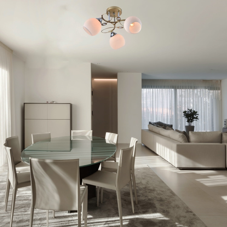 Żyrandol Goldio 3 to elegancka propozycja do klasycznych i nowoczesnych wnętrz, w których liczy się subtelny efekt dekoracyjny. Złota konstrukcja o delikatnie falowanych ramionach została uzupełniona trzema mlecznymi, ryflowanymi kloszami, które miękko rozpraszają światło. Dodatkowe akcenty w postaci dekoracyjnych elementów podkreślają lekko biżuteryjny charakter lampy, czyniąc ją wyrazistym, ale nienachalnym punktem aranżacji. Idealnie sprawdzi się w salonie, sypialni lub eleganckiej jadalni.
