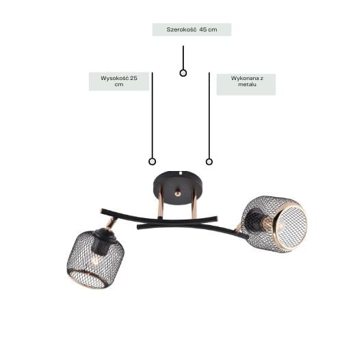 Żyrandol Hortensjo 2 to stylowe oświetlenie inspirowane nowoczesnym loftem i industrialnym designem. Dwa metalowe, ażurowe klosze w czarnym kolorze z delikatnymi złotymi akcentami nadają lampie wyrazisty, a jednocześnie elegancki charakter. Lekko wygięte ramiona podkreślają dynamiczną formę, a otwarta konstrukcja kloszy pozwala światłu swobodnie się rozchodzić, tworząc ciekawy efekt wizualny. Model świetnie sprawdzi się w salonie, jadalni, kuchni lub nowoczesnym gabinecie.