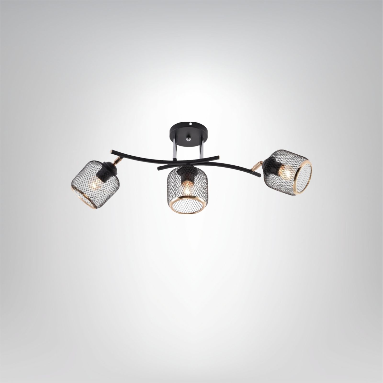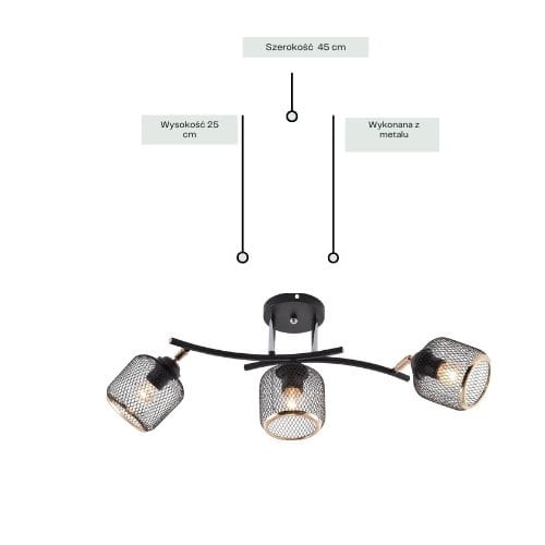 Żyrandol Hortensjo 3 to efektowne oświetlenie w stylu loftowo-industrialnym, które łączy surową formę z eleganckimi detalami. Trzy metalowe, siatkowe klosze w czarnym kolorze, wykończone subtelnymi złotymi obręczami, tworzą spójną i nowoczesną kompozycję. Delikatnie wygięte ramiona nadają konstrukcji lekkości i dynamiki, a ażurowa forma kloszy pięknie eksponuje źródło światła, zapewniając nastrojowe, dekoracyjne oświetlenie. Model idealnie sprawdzi się w salonie, jadalni, kuchni lub wnętrzach typu loft.