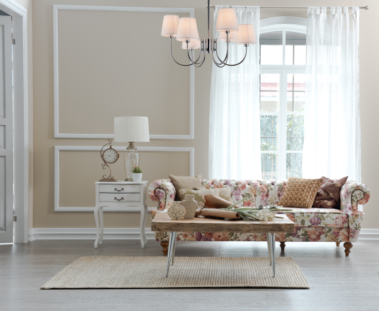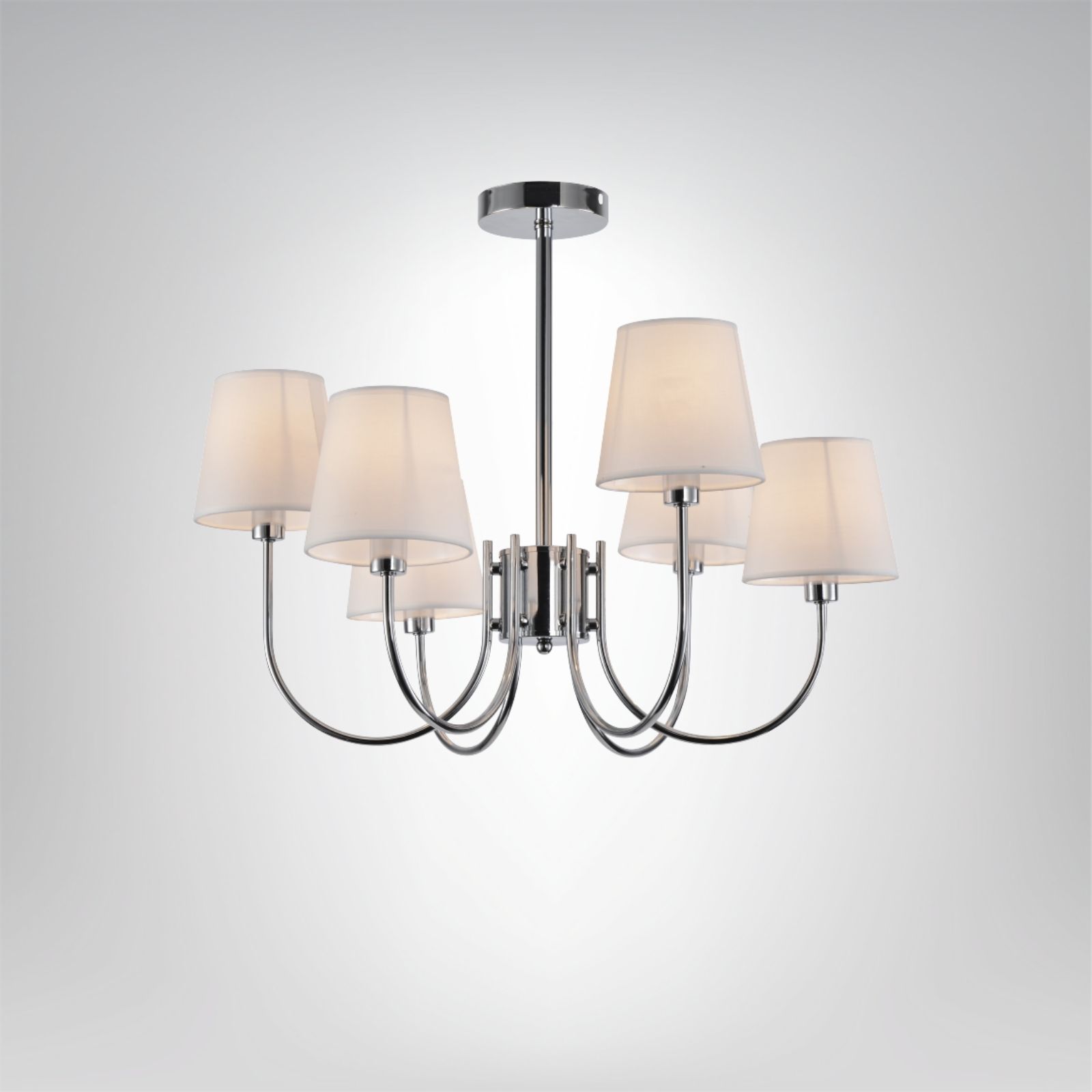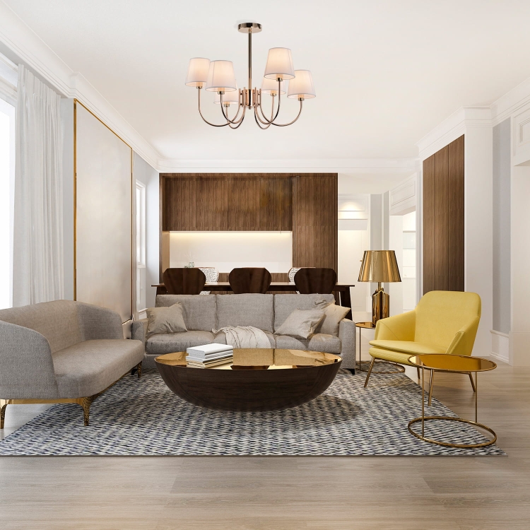 Stylowy żyrandol z sześcioma punktami światła i jasnymi abażurami, idealny do eleganckich wnętrz. Dostępny w wersji chromowanej lub złotej, zapewnia efektowne i równomierne oświetlenie.