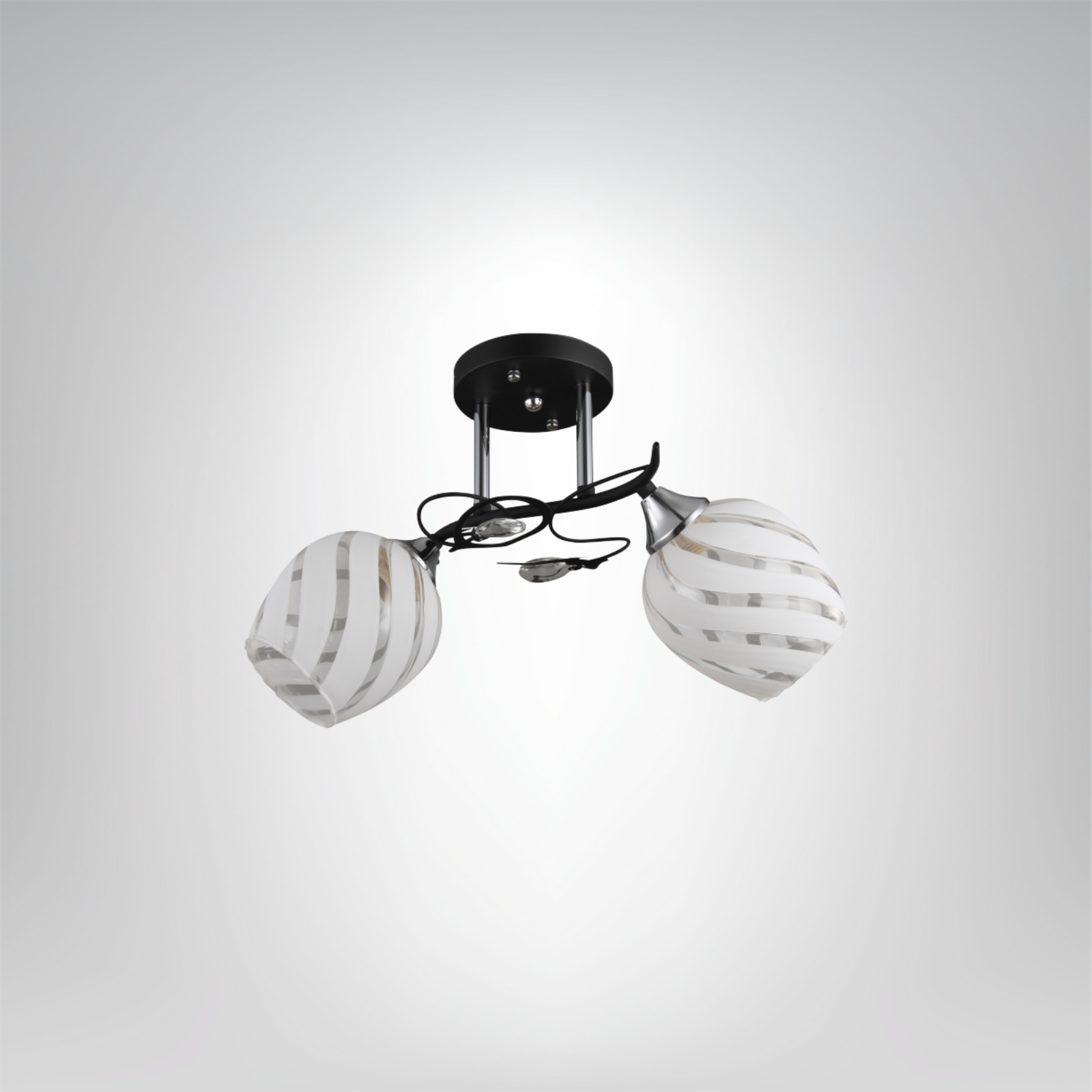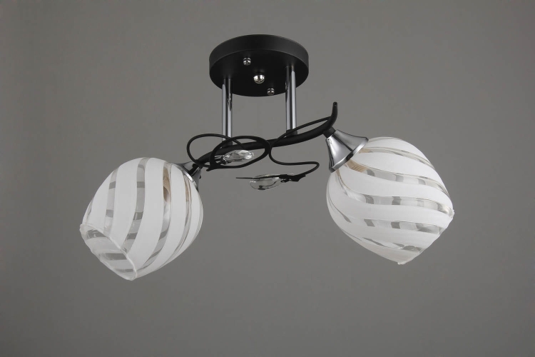 Żyrandol Nelson 2 to stylowe oświetlenie sufitowe o lekkiej, nowoczesnej formie. Dwa dekoracyjne klosze z białego szkła, ozdobione subtelnymi, poziomymi pasami, pięknie rozpraszają światło i nadają wnętrzu przyjemny, harmonijny klimat. Czarne, delikatnie wygięte ramiona w połączeniu z chromowanymi detalami tworzą elegancki kontrast, który dobrze odnajdzie się zarówno w nowoczesnych, jak i klasycznych aranżacjach. Model Nelson 2 sprawdzi się doskonale w sypialni, mniejszym salonie lub jako stylowe oświetlenie strefowe w jadalni.