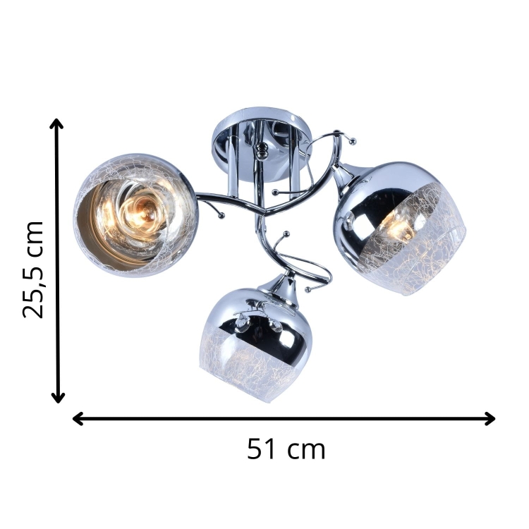 Żyrandol Olmi 3 to stylowa lampa sufitowa o wyraźnie dekoracyjnym charakterze, która przyciąga uwagę efektownymi kloszami i dynamiczną formą. Trzy chromowane klosze z delikatnym, spękanym wzorem szkła pięknie odbijają światło, tworząc ciekawe refleksy i przyjemny klimat w pomieszczeniu. Falujące, metalowe ramiona nadają całości lekkości i nowoczesnego stylu, dzięki czemu lampa doskonale sprawdzi się w salonie, jadalni lub sypialni. Olmi 3 to połączenie funkcjonalnego oświetlenia z wyrazistą dekoracją wnętrza.
